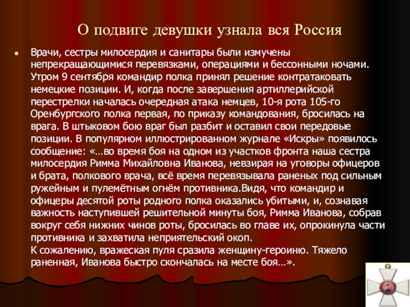 Утром 9 сентября командир полка принял решение контратаковать немецкие позиции. И, когда после завершения артиллерийской перестрелки началась очередная атака немцев, 10-я рота 105-го Оренбургского полка первая, по приказу командования, бросилась на врага. В штыковом бою враг был разбит и оставил свои передовые позиции. В популярном иллюстрированном журнале «Искры» появилось сообщение: «…во время боя на одном из участков фронта наша сестра милосердия Римма Михайловна Иванова, невзирая на уговоры офицеров и брата, полкового врача, всё время перевязывала раненых под сильным ружейным и пулемётным огнём противника.Видя, что командир и офицеры десятой роты родного полка оказались убитыми, и, сознавая важность наступившей решительной минуты боя, Римма Иванова, собрав вокруг себя нижних чинов роты, бросилась во главе их, опрокинула части противника и захватила неприятельский окоп.