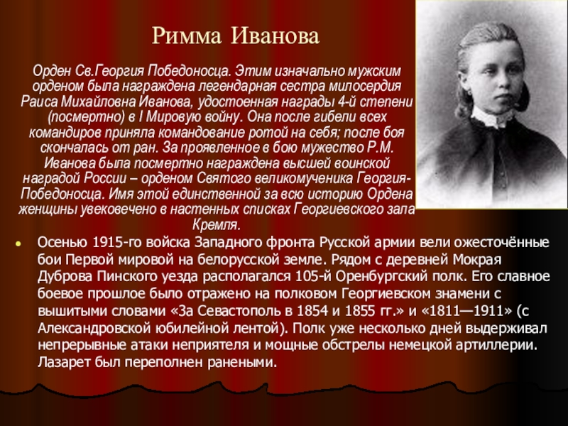 Орден Св.Георгия Победоносца. Этим изначально мужским орденом была награждена легендарная сестра милосердия Раиса Михайловна Иванова, удостоенная награды 4-й степени (посмертно) в I Мировую войну. Она после гибели всех командиров приняла командование ротой на себя; после боя скончалась от ран. За проявленное в бою мужество Р.М. Иванова была посмертно награждена высшей воинской наградой России – орденом Святого великомученика Георгия-Победоносца. Имя этой единственной за всю историю Ордена женщины увековечено в настенных списках Георгиевского зала Кремля.