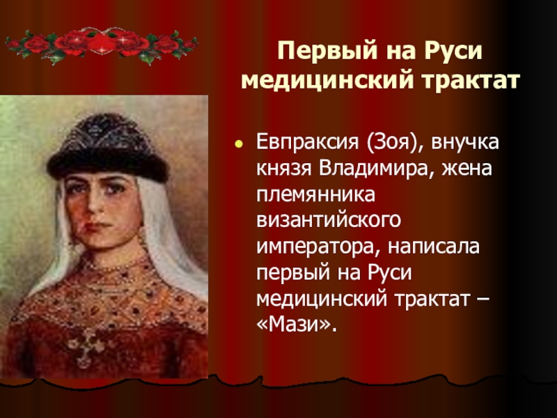 византийского императора, написала первый на Руси медицинский трактат – «Мази».