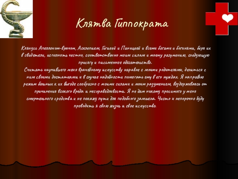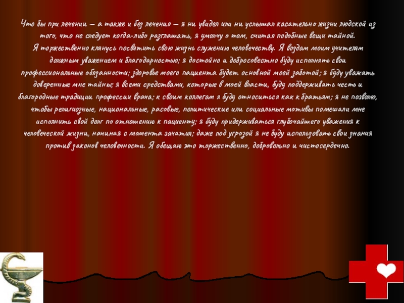 Считать научившего меня врачебному искусству наравне с моими родителями, делиться с ним своими достатками и в случае надобности помогать ему в его нуждах. Я направлю режим больных к их выгоде сообразно с моими силами и моим разумением, воздерживаясь от причинения всякого вреда и несправедливости. Я не дам никому просимого у меня смертельного средства и не покажу пути для подобного замысла. Чисто и непорочно буду проводить я свою жизнь и свое искусство.