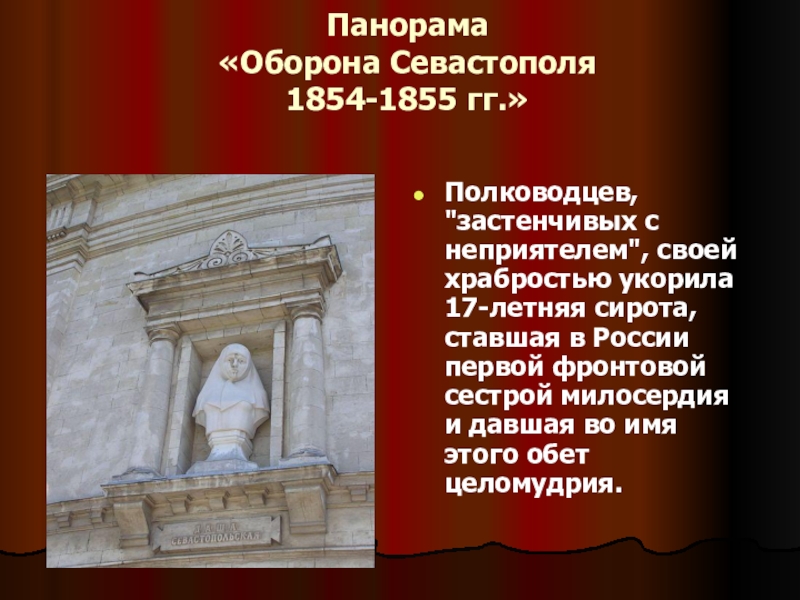Слайд 4Дарья Севастопольская - русская патриотка, первая военная сестра милосердия. Легендарная личность