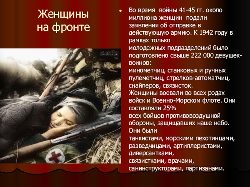 минометчиц, станковых и ручных пулеметчиц, стрелков-автоматчиц, снайперов, связисток.