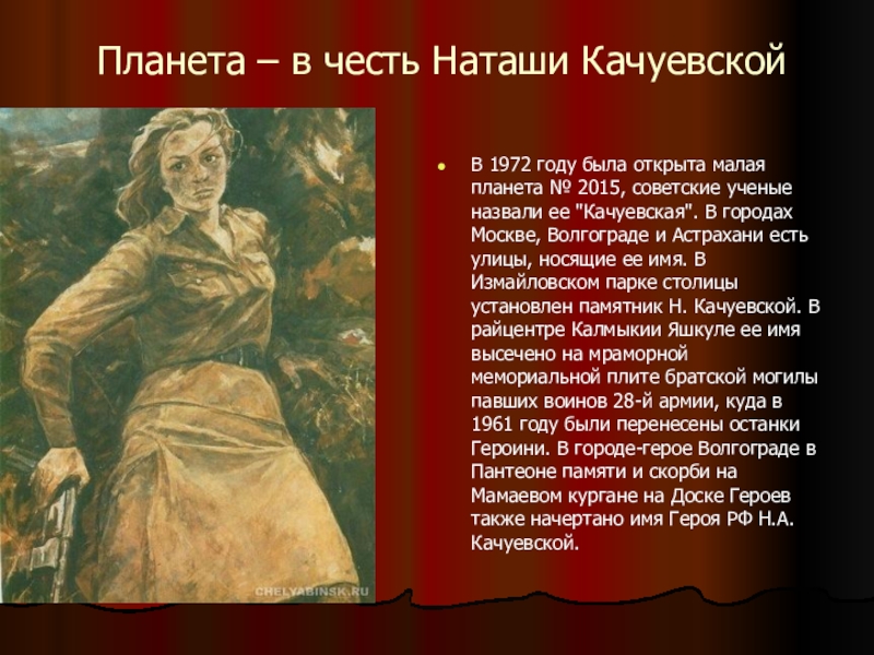 планета № 2015, советские ученые назвали ее "Качуевская". В городах Москве, Волгограде и Астрахани есть улицы, носящие ее имя. В Измайловском парке столицы установлен памятник Н. Качуевской. В райцентре Калмыкии Яшкуле ее имя высечено на мраморной мемориальной плите братской могилы павших воинов 28-й армии, куда в 1961 году были перенесены останки Героини. В городе-герое Волгограде в Пантеоне памяти и скорби на Мамаевом кургане на Доске Героев также начертано имя Героя РФ Н.А. Качуевской.