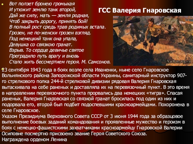 23 сентября 1943 года в боях возле села Иваненки, ныне село Гнаровское Вольнянского района Запорожской области Украины, санитарный инструктор 907-го стрелкового полка 244-й стрелковой дивизии рядовая Валерия Гнаровская вытаскивала на себе раненых и доставляла их на перевязочный пункт. В это время в направлении перевязочного пункта прорвались два немецких «тигра». Спасая раненых, Валерия Гнаровская со связкой гранат бросилась под один из них и подорвала его, второй был подбит подоспевшими красноармейцами. Похоронена в селе Гнаровское.