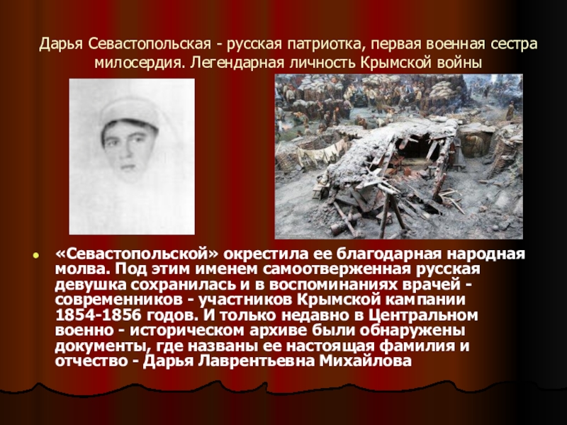 «Севастопольской» окрестила ее благодарная народная молва. Под этим именем самоотверженная русская девушка сохранилась и в воспоминаниях врачей - современников - участников Крымской кампании 1854-1856 годов. И только недавно в Центральном военно - историческом архиве были обнаружены документы, где названы ее настоящая фамилия и отчество - Дарья Лаврентьевна Михайлова