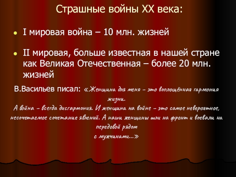 А война – всегда дисгармония. И женщина на войне – это самое невероятное, несочетаемое сочетание явлений. А наши женщины шли на фронт и воевали на передовой рядом