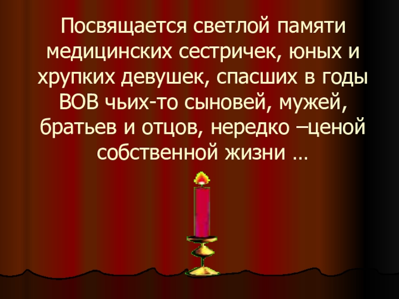 Слайд 2Посвящается светлой памяти медицинских сестричек, юных и хрупких девушек, спасших в