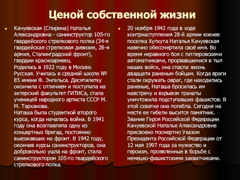20 ноября 1942 года в ходе контрнаступления 28-й армии южнее поселка Хулхута Наталья Качуевская навечно обессмертила своё имя. Во время неравного боя с гитлеровскими автоматчиками, прорвавшимися в тыл наших войск, она спасла жизнь двадцати раненым бойцам. Когда враги стали окружать овраг, где находились раненые, Наташа бросилась им навстречу и взрывом гранаты уничтожила подступавших фашистов. В этой схватке она погибла. Сегодня на месте ее гибели высится памятник.