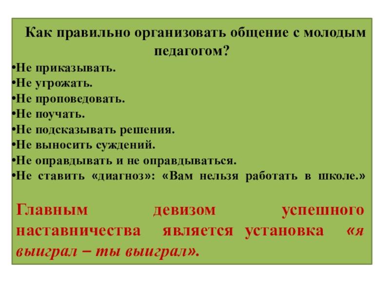 Не ставить «диагноз»: «Вам нельзя работать в школе.» Главным девизом успешного наставничества является установка «я выиграл – ты выиграл».