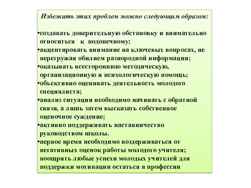 Избежать этих проблем можно следующим образом:создавать доверительную обстановку и внимательно относиться  к подопечному;акцентировать внимание на ключевых