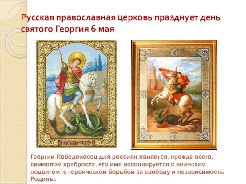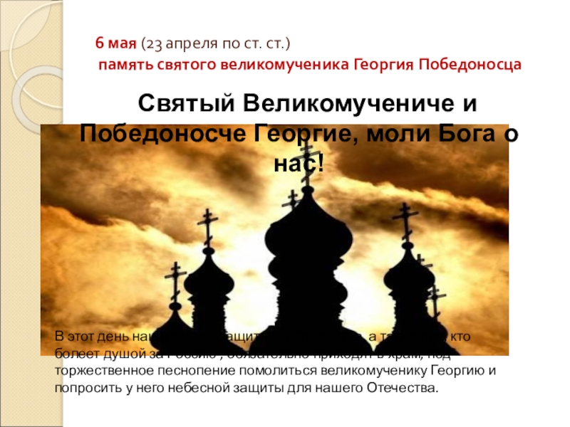 В этот день наши воины, защитники Отечества, а также все, кто болеет душой за Россию , обязательно приходят в храм, под торжественное песнопение помолиться великомученику Георгию и попросить у него небесной защиты для нашего Отечества.