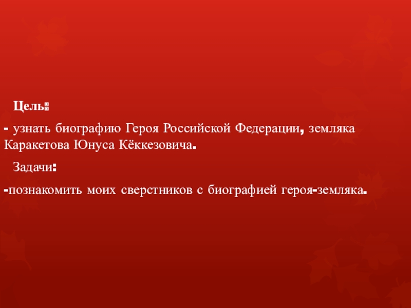 Цель: - узнать биографию Героя Российской Федерации, земляка Каракетова Юнуса Кёккезовича.  Задачи:-познакомить моих сверстников с