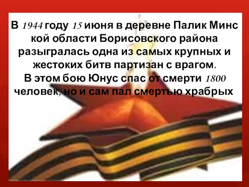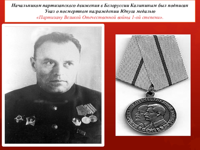 Начальником партизанского движения в Белоруссии Калининым был подписан   Указ о посмертном награждении Юнуса медалью