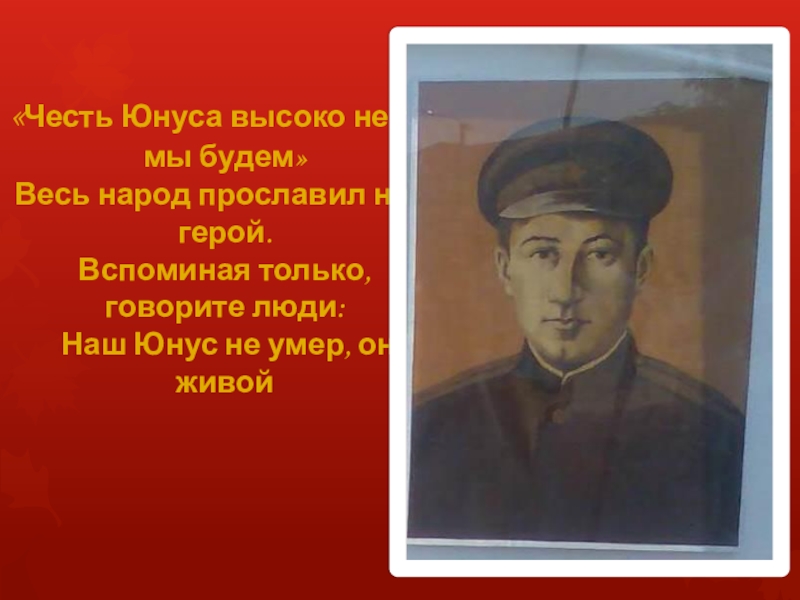 Слайд 26 «Честь Юнуса высоко нести мы будем» Весь народ прославил наш герой. Вспоминая только,