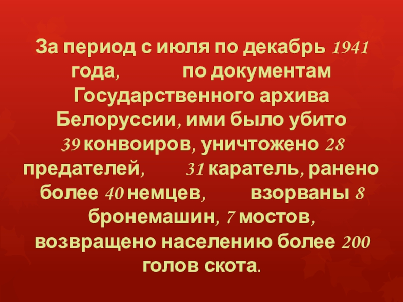 по до­кументам Государственного архива Белоруссии, ими было убито 39 конвоиров, уничтожено 28 предателей, 31 каратель, ранено более 40 немцев, взорваны 8 бронемашин, 7 мостов, возвращено населению более 200 голов скота.