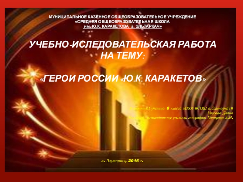 МУНИЦИПАЛЬНОЕ КАЗЁННОЕ ОБЩЕОБРАЗОВАТЕЛЬНОЕ УЧРЕЖДЕНИЕ«СРЕДНЯЯ ОБЩЕОБРАЗОВАТЕЛЬНАЯ ШКОЛА им. Ю.К. КАРАКЕТОВА а. ЭЛЬТАРКАЧ»   УЧЕБНО-ИСЛЕДОВАТЕЛЬСКАЯ РАБОТАНА ТЕМУ: «ГЕРОИ РОССИИ «Ю.К. КАРАКЕТОВ»  Выполнила: