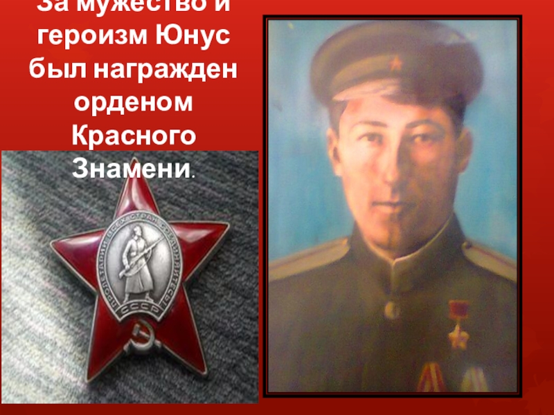 Слайд 18За мужество и героизм Юнус был награжден орденом Красного Знамени.