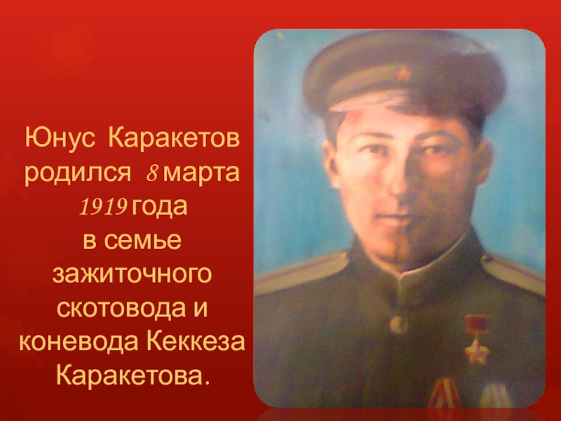 Слайд 4Юнус Каракетов родился 8 марта 1919 года
