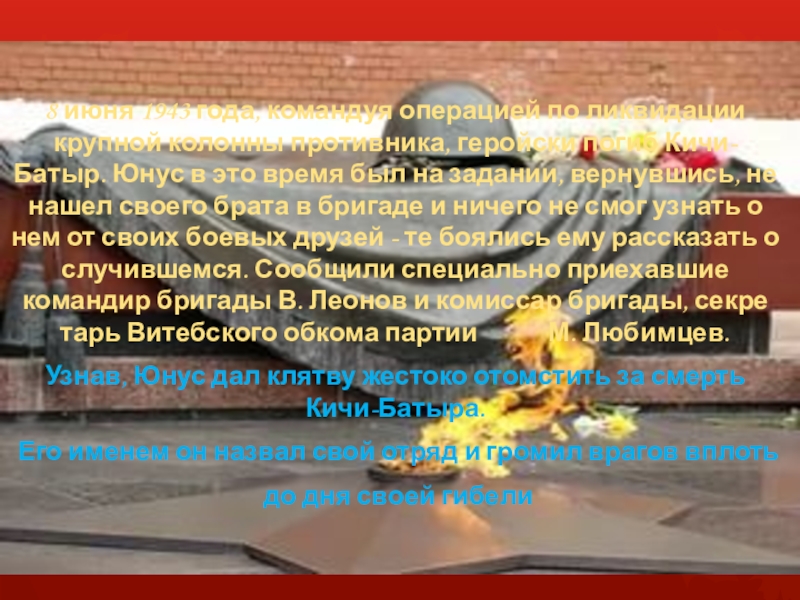 геройски погиб Кичи-Батыр. Юнус в это время был на задании, вернувшись, не нашел своего брата в бригаде и ничего не смог узнать о нем от своих боевых друзей - те боялись ему рассказать о случившемся. Сообщили спе­циально приехавшие командир бригады В. Леонов и комиссар бригады, секре­тарь Витебского обкома партии М. Любимцев.