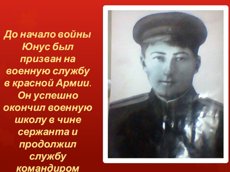 Слайд 12До начало войны Юнус был призван на военную службу в красной