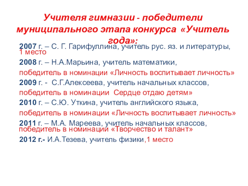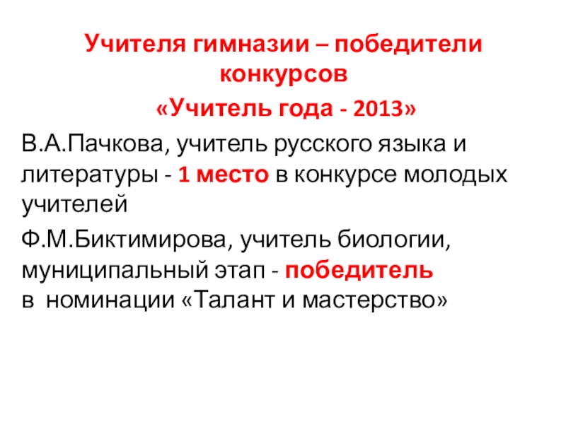 Учителя гимназии - победители муниципального этапа конкурса «Учитель года»: