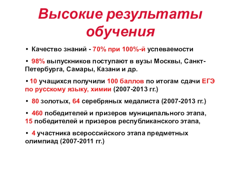 98% выпускников поступают в вузы Москвы, Санкт-Петербурга, Самары, Казани и др.