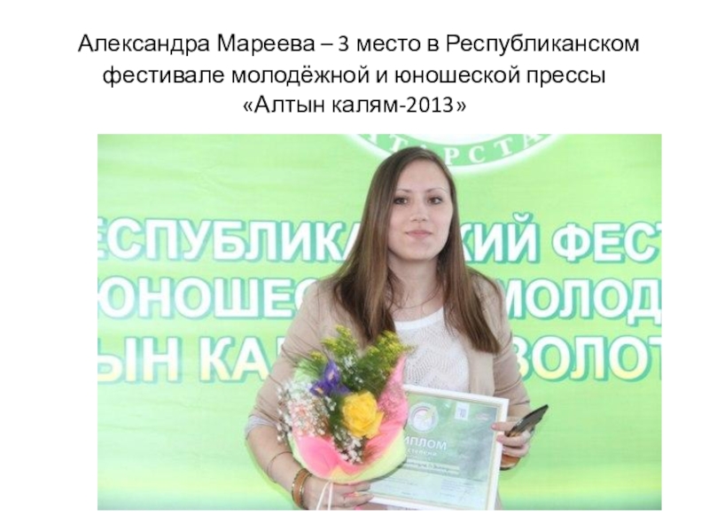 Слайд 33 Александра Мареева – 3 место в Республиканском фестивале молодёжной и