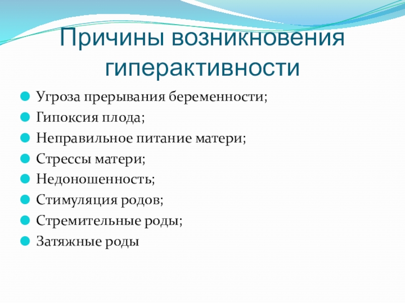 Причины возникновения гиперактивностиУгроза прерывания беременности;Гипоксия плода;Неправильное питание матери;Стрессы матери;Недоношенность;Стимуляция родов;Стремительные роды;Затяжные роды