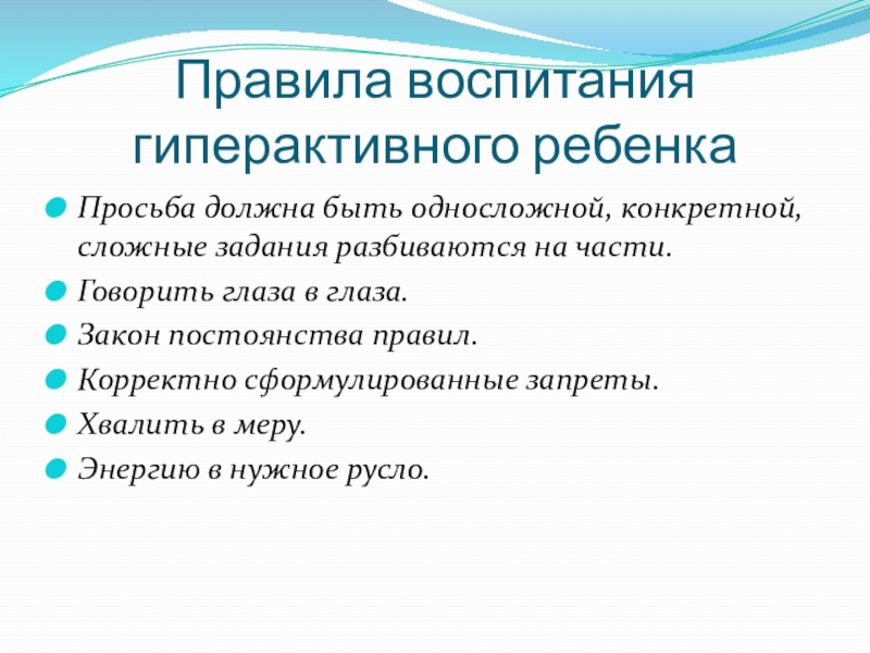 Правила воспитания гиперактивного ребенкаПросьба должна быть односложной, конкретной, сложные задания разбиваются на части.Говорить глаза в глаза.Закон постоянства