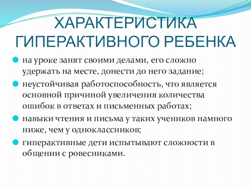 ХАРАКТЕРИСТИКА ГИПЕРАКТИВНОГО РЕБЕНКАна уроке занят своими делами, его сложно удержать на месте, донести до него задание;неустойчивая работоспособность,