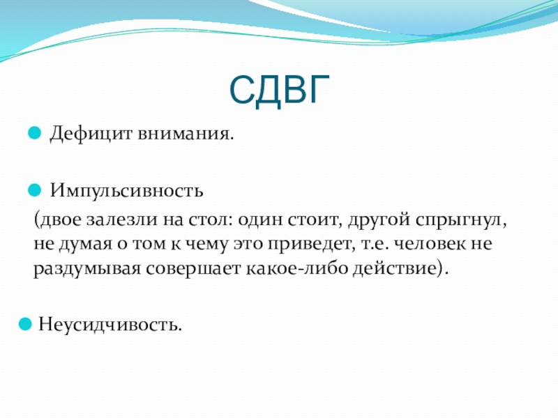 СДВГДефицит внимания.Импульсивность(двое залезли на стол: один стоит, другой спрыгнул, не думая о том к чему это приведет,