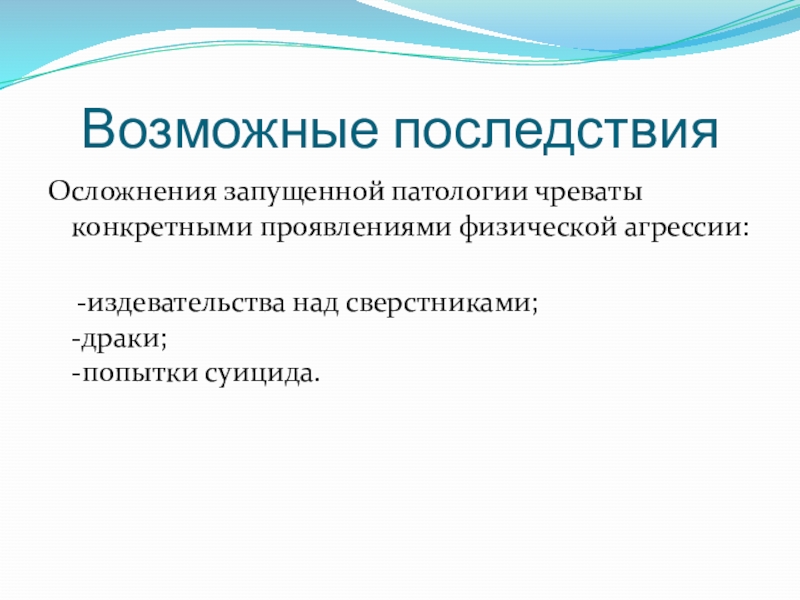Возможные последствияОсложнения запущенной патологии чреваты конкретными проявлениями физической агрессии:   -издевательства над сверстниками; -драки; -попытки суицида.