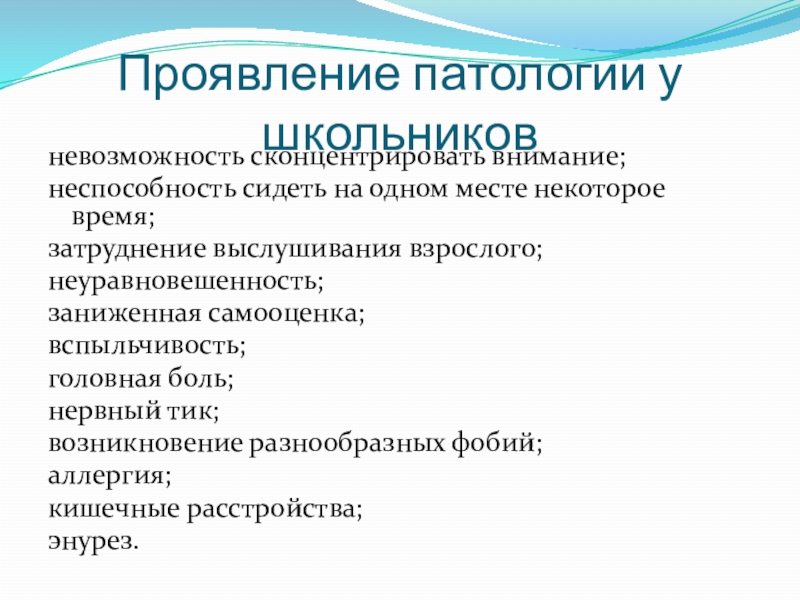 Проявление патологии у школьниковневозможность сконцентрировать внимание;неспособность сидеть на одном месте некоторое время;затруднение выслушивания взрослого;неуравновешенность;заниженная самооценка;вспыльчивость;головная боль;нервный тик;возникновение