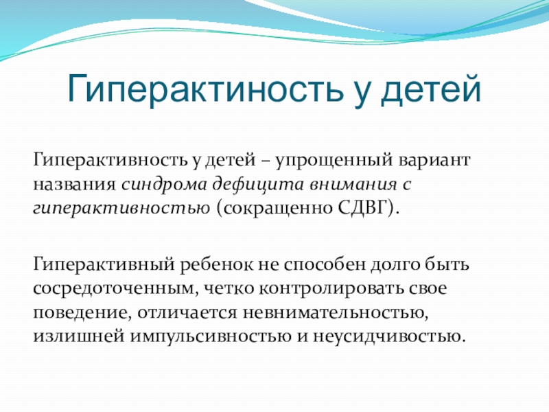 Гиперактиность у детей  Гиперактивность у детей – упрощенный вариант названия синдрома дефицита внимания с гиперактивностью (сокращенно СДВГ). Гиперактивный