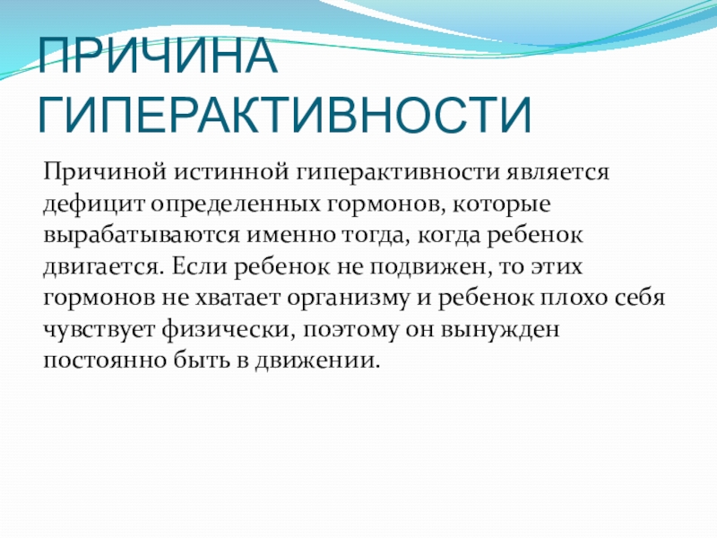 ПРИЧИНА ГИПЕРАКТИВНОСТИПричиной истинной гиперактивности является дефицит определенных гормонов, которые вырабатываются именно тогда, когда ребенок двигается. Если ребенок