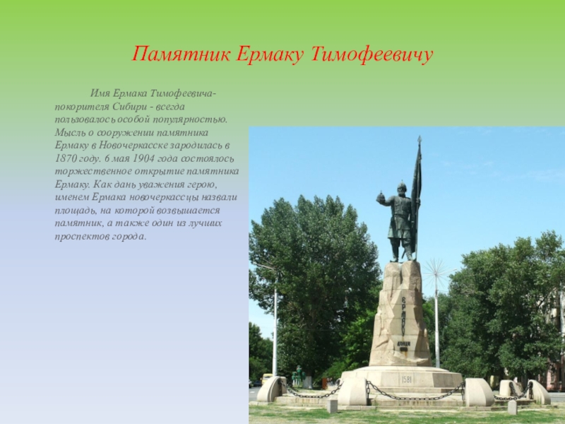 Мысль о сооружении памятника Ермаку в Новочеркасске зародилась в 1870 году. 6 мая 1904 года состоялось торжественное открытие памятника Ермаку. Как дань уважения герою, именем Ермака новочеркассцы назвали площадь, на которой возвышается памятник, а также один из лучших проспектов города.