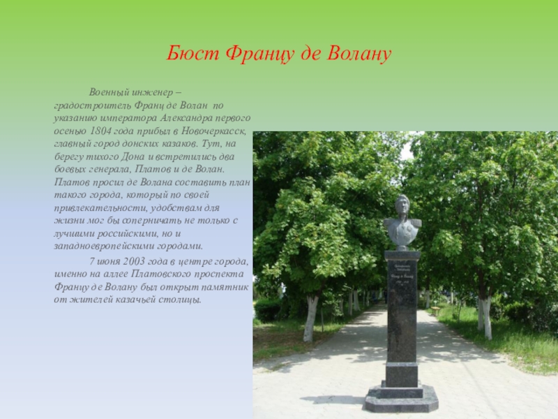 7 июня 2003 года в центре города, именно на аллее Платовского проспекта Францу де Волану был открыт памятник от жителей казачьей столицы.