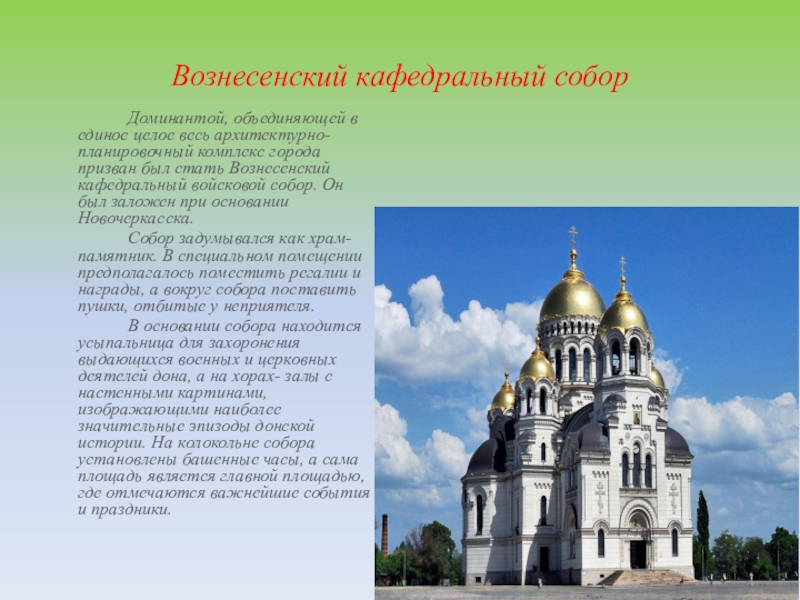 призван был стать Вознесенский кафедральный войсковой собор. Он был заложен при основании Новочеркасска.