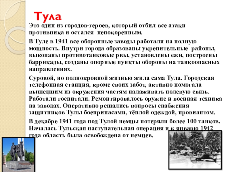 В декабре 1941 года под Тулой немцы потеряли более 100 танков. Началась Тульская наступательная операция и к январю 1942 года область была освобождена от немцев.