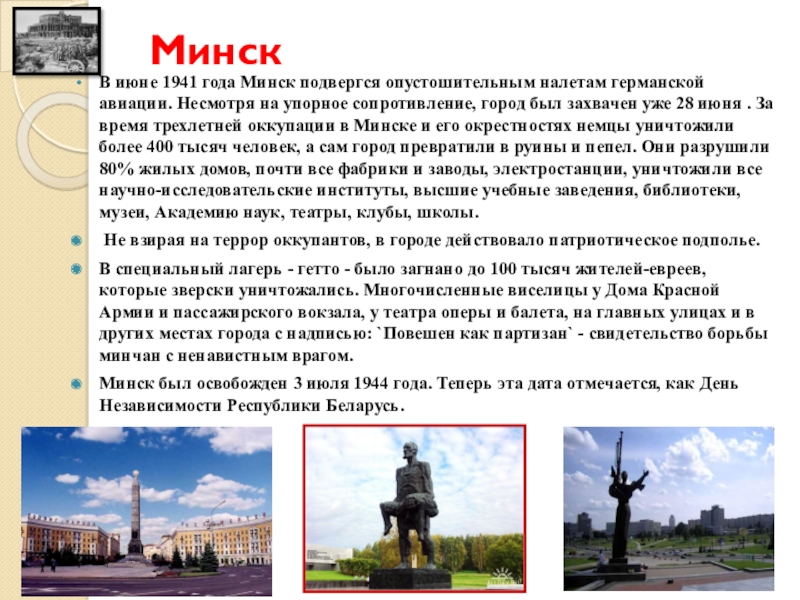 на упорное сопротивление, город был захвачен уже 28 июня . За время трехлетней оккупации в Минске и его окрестностях немцы уничтожили более 400 тысяч человек, а сам город превратили в руины и пепел. Они разрушили 80% жилых домов, почти все фабрики и заводы, электростанции, уничтожили все научно-исследовательские институты, высшие учебные заведения, библиотеки, музеи, Академию наук, театры, клубы, школы.