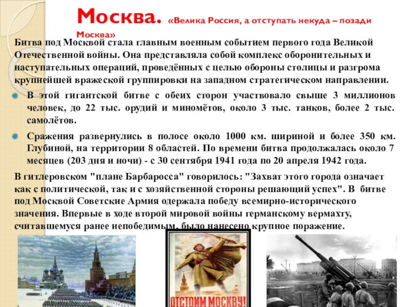 Слайд 16Москва. «Велика Россия, а отступать некуда – позади Москва»