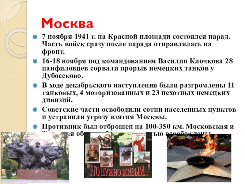 16-18 ноября под командованием Василия Клочкова 28 панфиловцев сорвали прорыв немецких танков у Дубосеково.