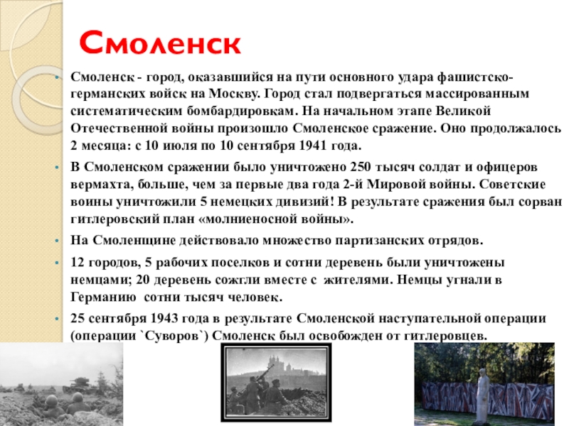 Москву. Город стал подвергаться массированным систематическим бомбардировкам. На начальном этапе Великой Отечественной войны произошло Смоленское сражение. Оно продолжалось 2 месяца: с 10 июля по 10 сентября 1941 года.