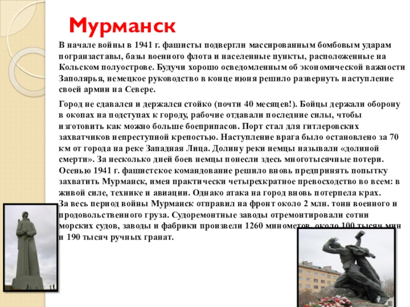 За весь период войны Мурманск отправил на фронт около 2 млн. тонн военного и продовольственного груза. Судоремонтные заводы отремонтировали сотни морских судов, заводы и фабрики произвели 1260 минометов, около 100 тысяч мин и 190 тысяч ручных гранат.