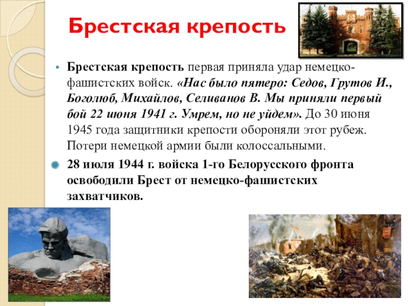 Седов, Грутов И., Боголюб, Михайлов, Селиванов В. Мы приняли первый бой 22 июня 1941 г. Умрем, но не уйдем». До 30 июня 1945 года защитники крепости обороняли этот рубеж. Потери немецкой армии были колоссальными.