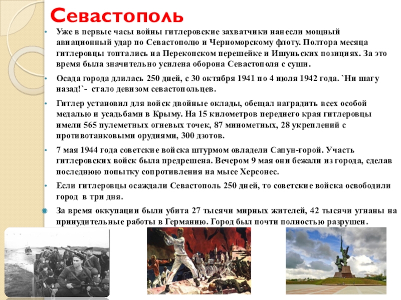 Осада города длилась 250 дней, с 30 октября 1941 по 4 июля 1942 года. `Ни шагу назад!`- стало девизом севастопольцев.