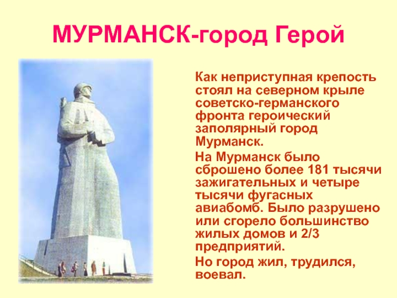 На Мурманск было сброшено более 181 тысячи зажигательных и четыре тысячи фугасных авиабомб. Было разрушено или сгорело большинство жилых домов и 2/3 предприятий.