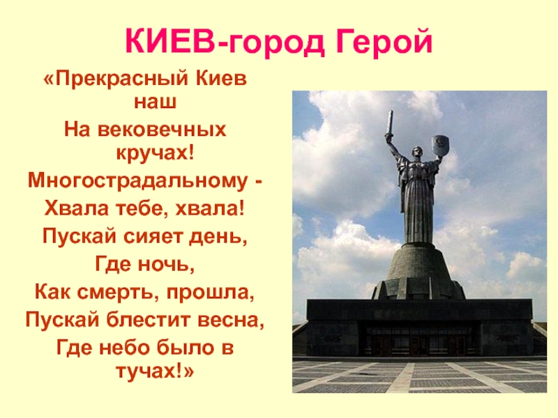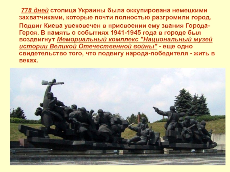 Подвиг Киева увековечен в присвоении ему звания Города-Героя. В память о событиях 1941-1945 года в городе был воздвигнут Мемориальный комплекс "Национальный музей истории Великой Отечественной войны" - еще одно свидетельство того, что подвигу народа-победителя - жить в веках.