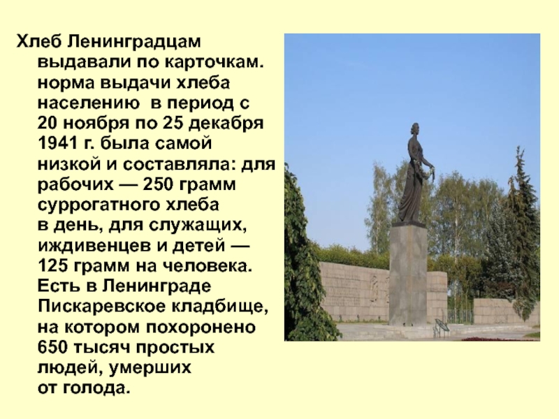 Есть в Ленинграде Пискаревское кладбище, на котором похоронено 650 тысяч простых людей, умерших от голода.