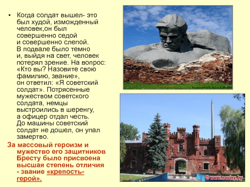 слепой. В подвале было темно и, выйдя на свет, человек потерял зрение. На вопрос: «Кто вы? Назовите свою фамилию, звание», он ответил: «Я советский солдат». Потрясенные мужеством советского солдата, немцы выстроились в шеренгу, а офицер отдал честь. До машины советский солдат не дошел, он упал замертво.